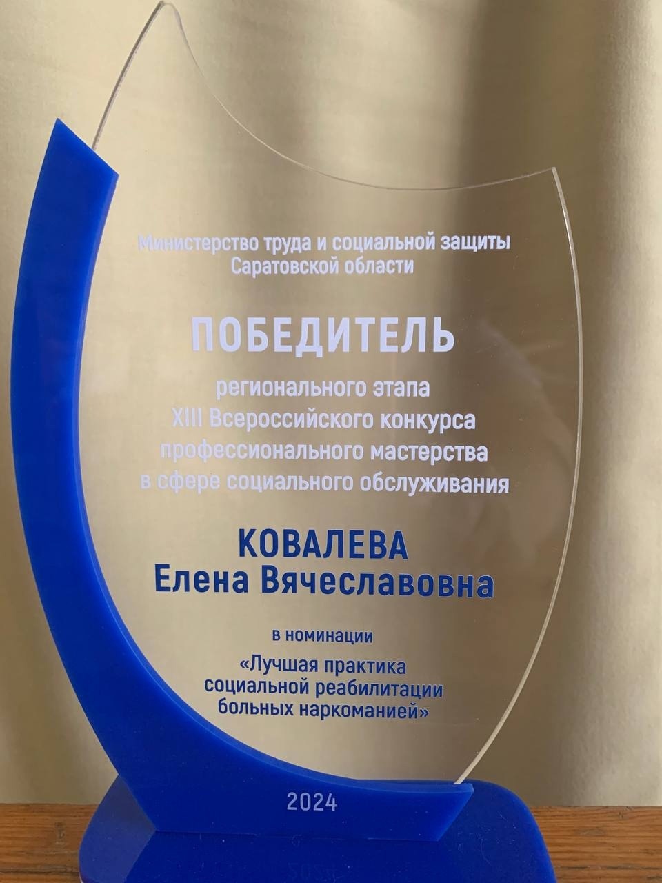 Елена Вячеславовна Ковалёва стала победителем регионального этапа Всероссийского конкурса профессионального мастерства в сфере социального обслуживания в номинации "Лучшая практика социальной реабилитации больных наркоманией"